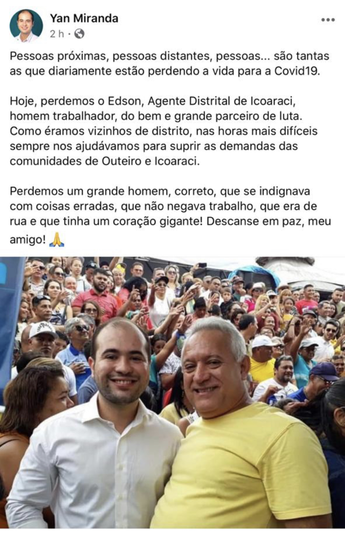O ex Agente Regional de Outeiro, Yan Miranda, também se manifestou em outra rede social:
