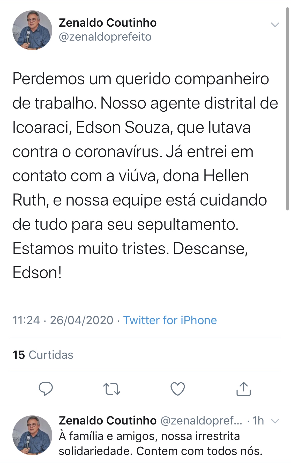 O Agente Distrital de Icoaraci morreu, neste domingo (26), vítima da covid-19. Édson estava internado em um hospital da região metropolitana, mas não resistiu. A notícia da morte do servidor da Prefeitura de Belém, Edson Souza, foi dada pelo prefeito de Belém, Zenaldo Coutinho, por meio de sua conta no Twitter.