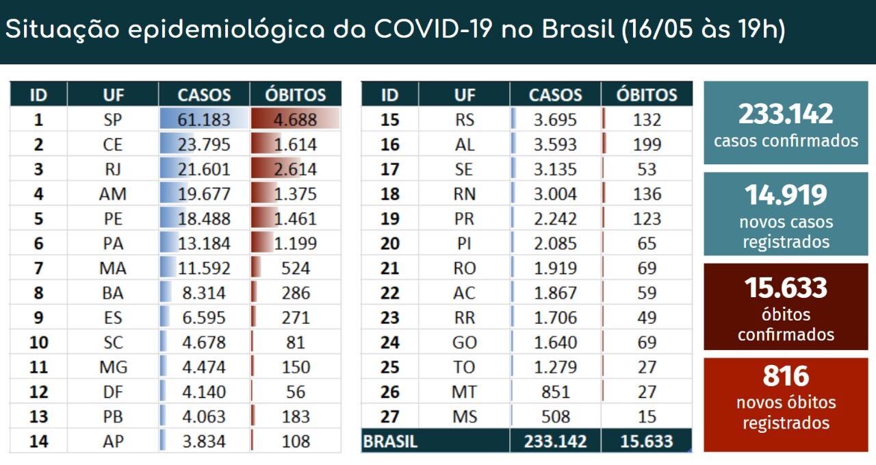 Com isso, o total de casos confirmados foi para 233.142, número que fez o Brasil ultrapassar a Itália, que tem 224.760 casos contabilizados, e a Espanha, que tem 230.698 registros, segundo a Johns Hopkins.