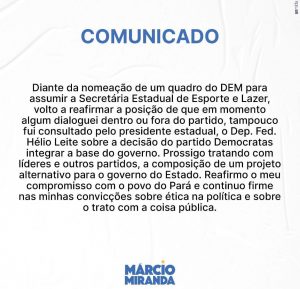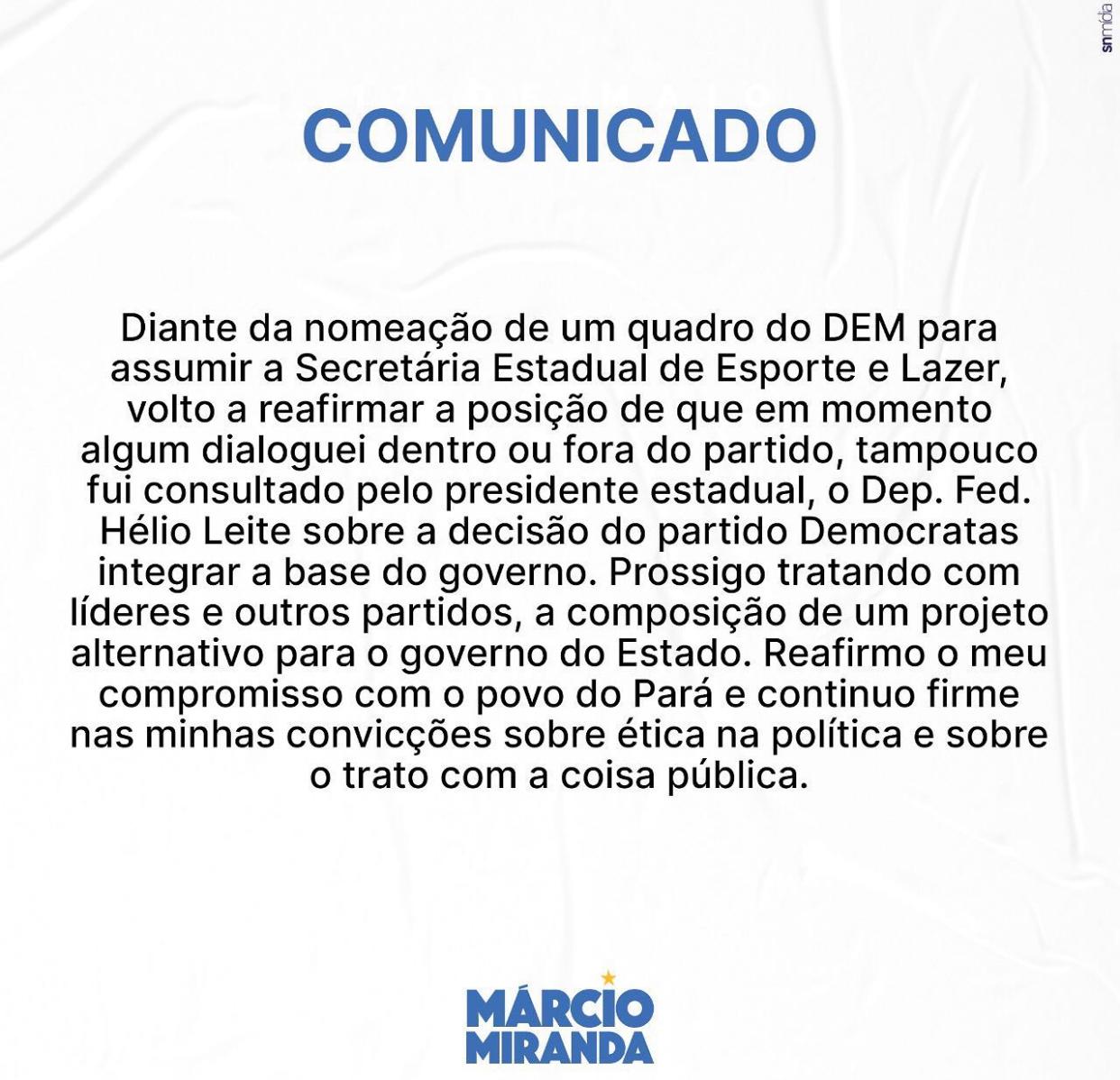 A nota de Márcio Miranda diz ainda que o ex-parlamentar segue dialogando com outras lideranças políticas e deixa transparecer que com a traição o caminho mais provável será a saída do partido DEM, do qual foi um dos responsáveis em alavancar e torná-lo uma das maiores forças políticas no Pará, conseguindo inclusive disputar o governo em 2018.