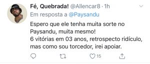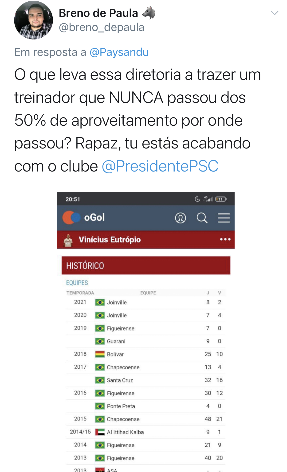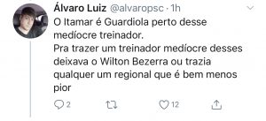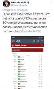 Assim que foi divulgado o nome do novo treinador, uma enxurrada de críticas foram disseminadas nas redes sociais. Isso porque os números do treinador contratado é de desconfiança para quem almeja subir de divisão. As últimas sequências do treinador no Guarani, Figueirense e Joinville são de poucas vitórias.